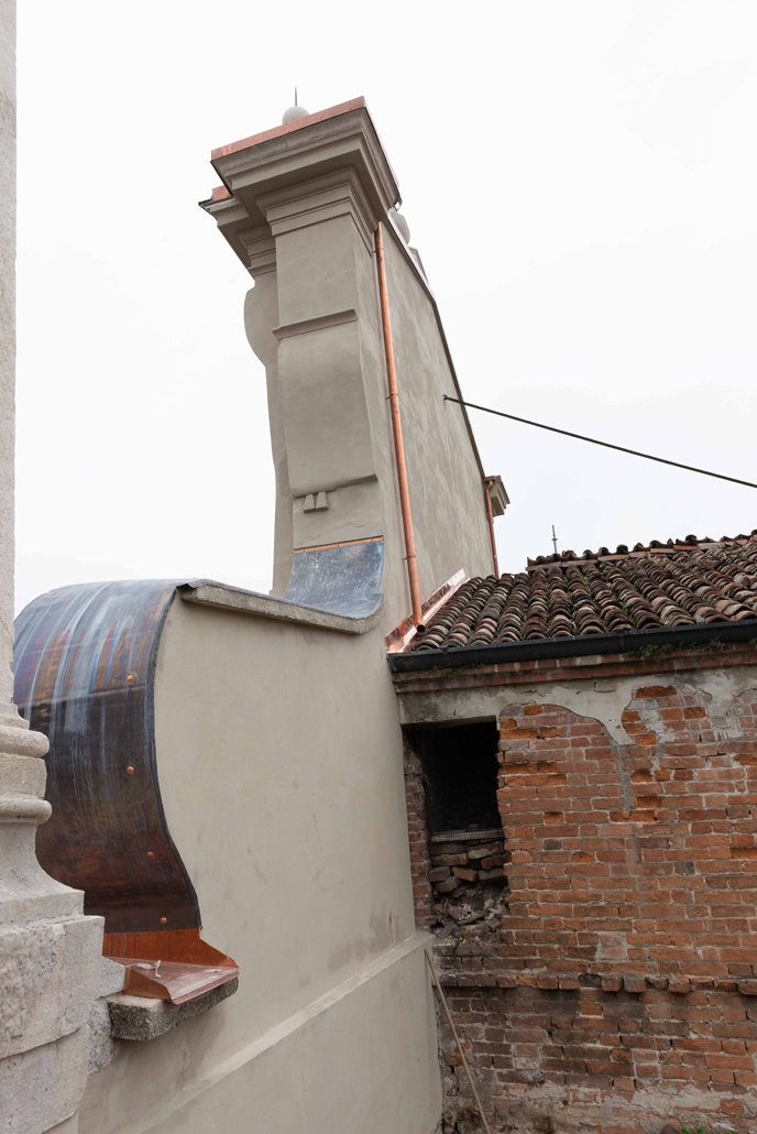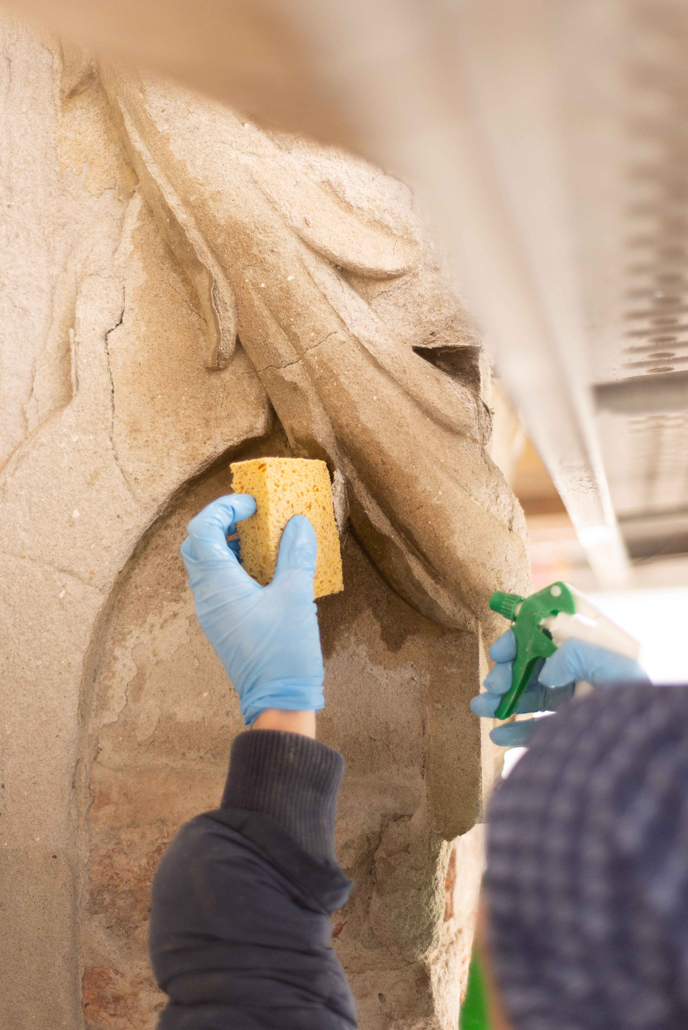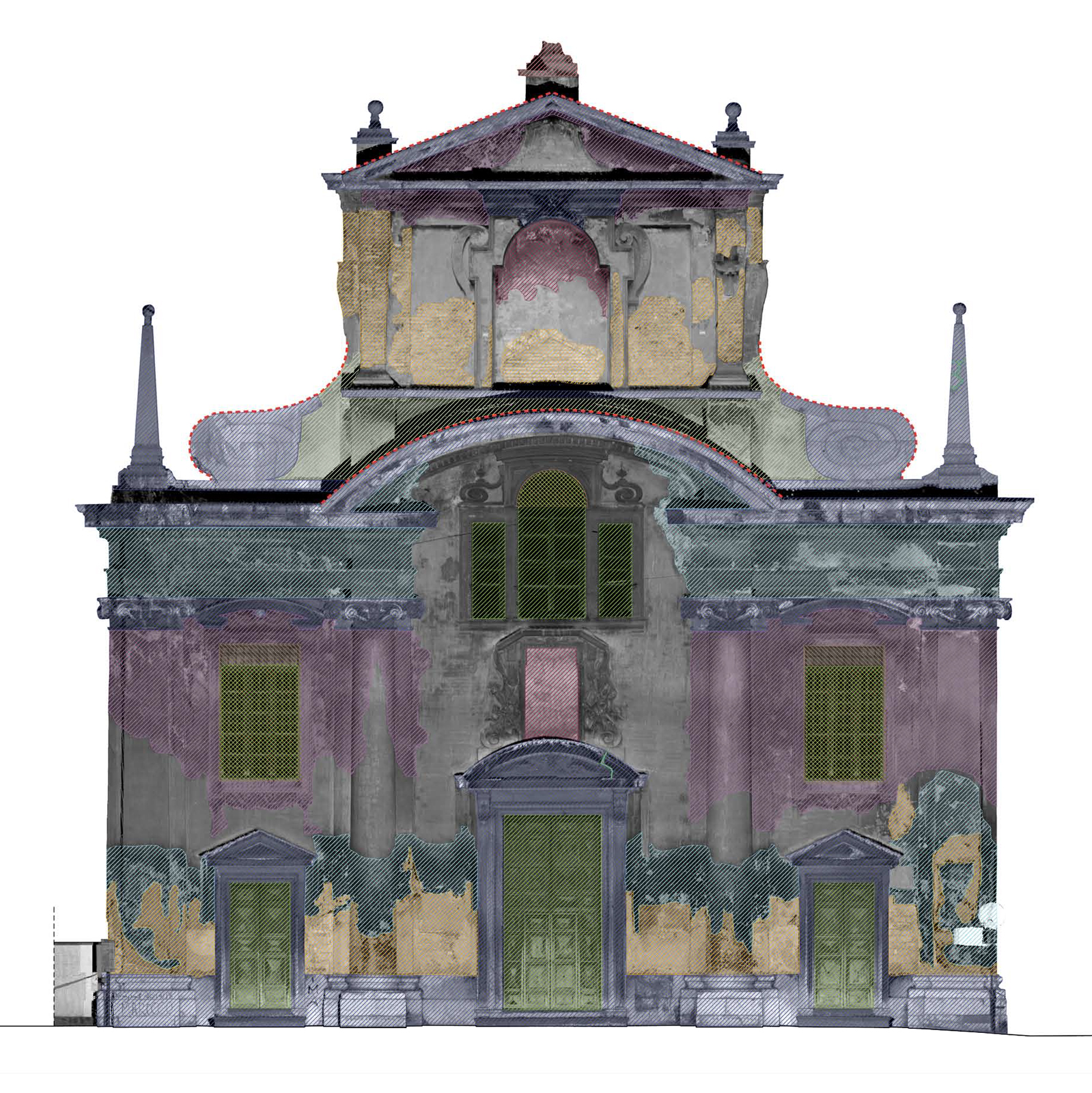Per quanto attiene l’analisi delle condizioni di degrado della facciata, occorre precisare che, oltre ai fenomeni degenerativi, che comunemente costituiscono le principali cause di degrado delle superfici esterne dell’edilizia storica, qui si sovrapposero anche i danni causati da interventi conservativi condotti secondo criteri e metodologie non rispettosi dei materiali antichi e non compatibili con gli stessi.