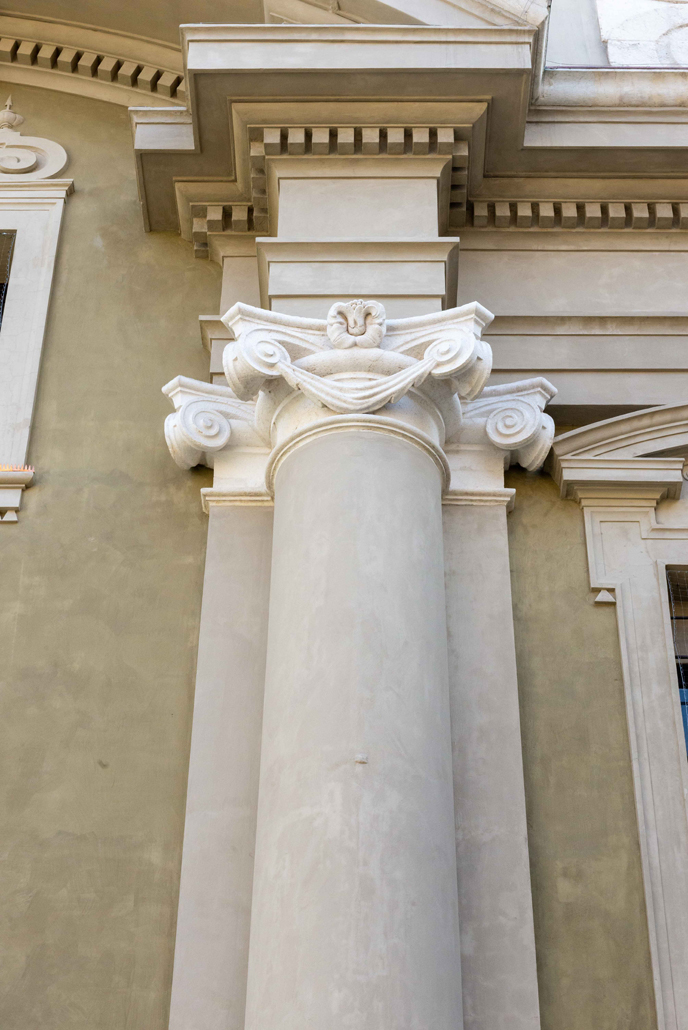 Nel complesso la facciata presentava un aspetto degradato anche per la presenza di riprese degli intonaci eseguite in modo sommario con malte cementizie e per le cattive condizioni di conservazione in cui si presentano i componenti lapidei, gli stucchi e i dipinti murali.